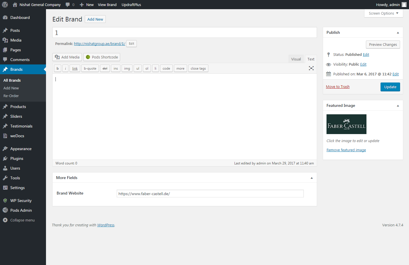 All Brands content in website can be added,edited or deleted from here.Adding a new brands Brands -> Add New and tittle section adding the tittle then the featured image section adding the image.Already existing brands can be updated from Brands -> All Brandsand mouse over click the edit link and changes done.Brand website section adding the link.