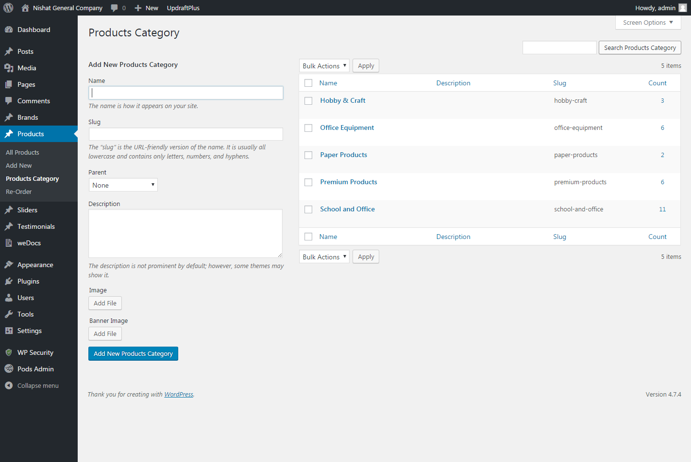 Product categories can be edited,deleted,created that is done by Products -> product Categories.In one side add new categories and the otherside listing the already existing product categories